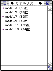 - The model list window lists all model names in the currently displayed scene file. Double-click each model name to show / hide that model.