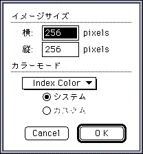 ◆ Image size Specify the size of the newly created window. Width: Enter the horizontal size. Height: Enter the vertical size. ◆ Color mode Specify the color mode (BitDepth) of the newly created window. RGB Color: Created in 32bit (RGB mode). Index Color: Created in 8bit (palette mode). ◇ System: Uses the Macintosh system palette. ◇ Custom: Uses the palette saved in the clipboard. - ● Open ...
