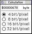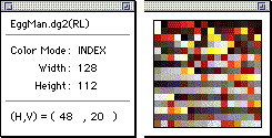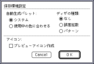 ◆ Automatically generated palette When converting from a format without palette information (PICT, RGB, etc.) to a format with palette information (DGT, BOB, etc.), a palette is automatically generated. Specify the method. ◇ System Use the system palette of Macintosh. ◇ Match the color in use Generates a palette optimized for the image. ◆ Type of dither Specify the type of dither processing when the above processing is performed. ◇ None No dither processing is performed. ◇ Error diffusion Dither processing is performed by the error diffusion method. ◇ Pattern Performs pattern dither processing. ◆ Icon ◇ Create preview icon Paste the image to the icon of the saved file. - ● Quit
