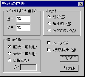 Specify the start number to place the generated texture data. The multiple texture data that have been cut out will be placed sequentially after the texture number specified here. If the texture data already exists, it will be overwritten by the generated data.- Immediately after Add Places immediately after the selected texture number.