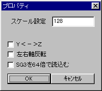 | Property | Set the scale, swap the Y and Z coordinates in 3D space, rotate the left and right axes, and read SG3 at 64x (same as "Properties" in the menu that appears when you click the right mouse button). |