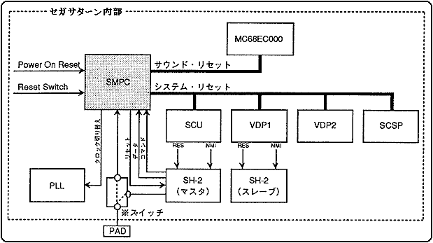★ HARDWARE Manual ★ Sega Saturn Overview ManualThe SMPC resets the entire Saturn system when the power is turned on or the reset button is pressed. In addition, commands from SH-2 are used to turn on / off the peripheral LSI inside Saturn, set and acquire the calendar clock, and collect data from the peripheral. In addition, the clock change command switches the horizontal resolution to 320 dots or 352 dots.