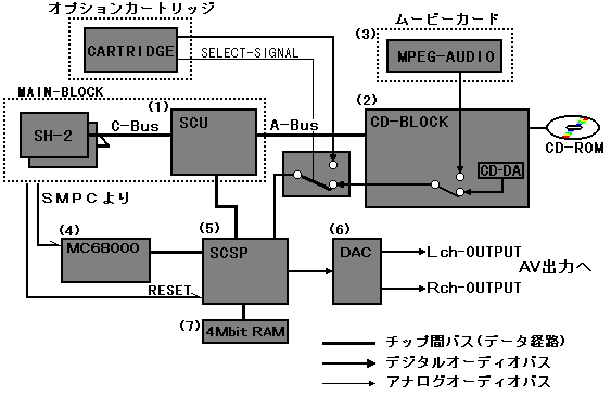 Regarding the output from each sound source, the number of sound sources that can be input to "SCSP" in Saturn is one stereo system, and CD-DA, MPEG-AUDIO, and external input from the cartridge in the middle CD block etc. Is to be selected.