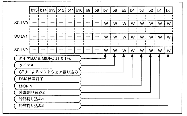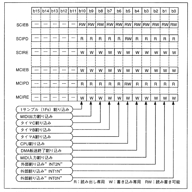 | 3 | Supports MIDI input interrupt An interrupt is generated when data is fetched from the empty FIFO buffer memory on the MIDI-IN side. It reads all the data from the FIFO buffer and is automatically cleared when the buffer is free. |