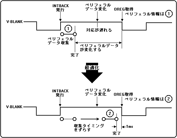 The purpose of optimizing the peripheral data collection time is to collect peripheral data as close as possible to V-BLANK-IN. In other words, the start of peripheral data collection should be as close as possible to V-BLANK-IN, and the time from peripheral data collection to SH-2 acquisition of peripheral data should be minimized. Figure 3.5 shows an overview of the operation of peripheral data acquisition time optimization. Figure 3.5 Overview of peripheral data acquisition time optimization