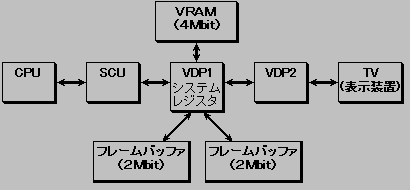VRAM (4Mbit DRAM) and two-sided frame buffer (2Mbit DRAM per side) are connected to VDP1. Image data is defined from the CPU to VRAM and output to the display device via the frame buffer.