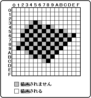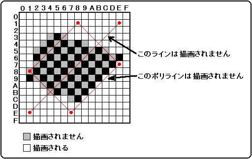 If mesh processing is specified (Mesh = 1), the parts will be drawn in a grid pattern every other pixel. Only pixels with an even number (XLSB XOR YLSB = 0) of "X coordinate value + Y coordinate value" are drawn, and odd-numbered bixels skip drawing and are not written. If the starting point of the 45 degree line is odd coordinates, nothing is drawn. Even if the polyline is 45 degrees and the vertices are odd coordinates, it may not be drawn.