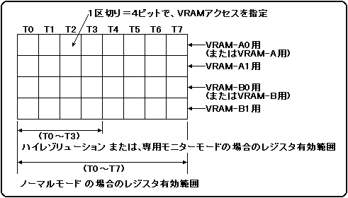 The VRAM cycle pattern register has registers corresponding to each bank of VRAM-A0, VRAM-A1, VRAM-B0, and VRAM-B1. If VRAM is not split in two, the register for VRAM-A0 will be used for VRAM-A, the register for VRAM-B0 will be used for VRAM-B, and the register for VRAM-A1 and VRAM-B1 will not be used. Hmm. The registers corresponding to each bank are divided into eight access timings from T0 to T7, and access is performed in order from the VRAM access indicated by the access command specified in the T0 bit. When the TV screen is in normal mode, all of T0 to T7 are enabled. In high resolution mode or dedicated monitor mode, only T0 to T3 are valid, and T4 to T7 are ignored. Figure 3.2 shows the VRAM cycle pattern registers used during one cycle. Figure 3.2 VRAM cycle pattern register