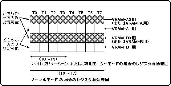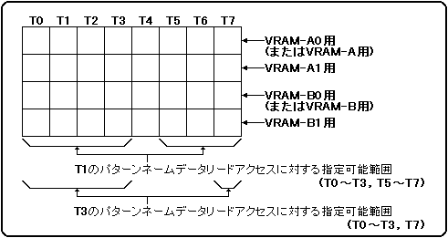 Timing when character pattern table data access can be specified | normal | 1 horizontal cell x 1 vertical cell 2 horizontal cells x 2 vertical cells | T0 to T2, | T0 to T3, | T0 to T3, | T0 to T3, | T0 to T3 | T1 ~ T3 | T2, T3 | T3 |