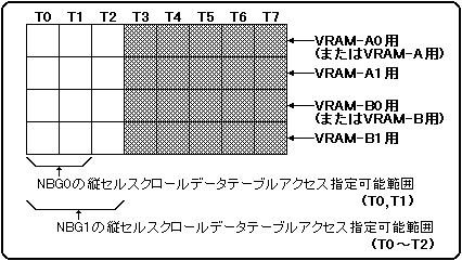 When using the vertical cell scroll function in NBG0 and NBG1, the vertical cell scroll table data must be read in addition to the pattern name data and character pattern data (bitmap pattern data). Vertical cell scroll table data read access is required once per cycle per page. Vertical cell scroll table data read access for NBG0 must be specified at the timing of T0 or T1, and vertical cell scroll table data read access for NBG1 must be specified at the timing within T0 to T2. Hmm. Also, the access for NBG0 and NBG1 must be in the same bank, and the access for NBG0 must be specified first.