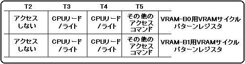 If you specify a CPU read / write or no access command for all access timings of VRAM that is not divided into two, CPU access is possible at any time during the screen display period. You can use this to use one of the VRAMs as auxiliary work RAM. Also, by switching the VRAM used to display the picture like a frame buffer, you can display the picture while rewriting it at high speed.