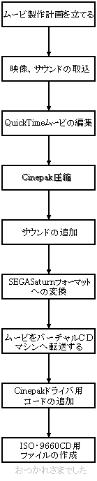 ★ MOVIE TOOLS GUIDE ★ Cinepak for SEGA SaturnThe process of incorporating the original audio, video and graphic material into the SEGA SATURN format depends on the original source material and the final format. The starting position of the process, the number of steps, the tools you need, etc. all depend on the equipment you have and what you want to do. This chapter provides information to help you decide which method is best for you.