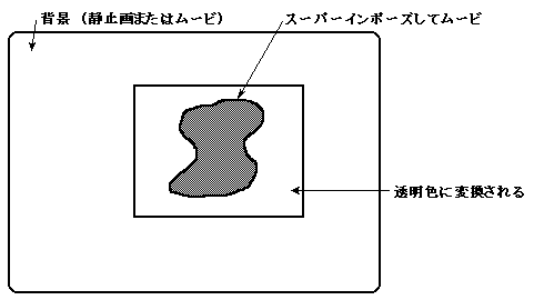 3.3 Super Impose You can use a chroma key shot to superimpose your subject on another still image or background of the movie. Superimpose is achieved by making the specific color specified by MovieToSaturn_J transparent when decoding it on SEGA SATURN. Therefore, the background you want to make transparent must be a single color. The super-impose movie can be used with or without sound. Figure 3.5 Super Impose
