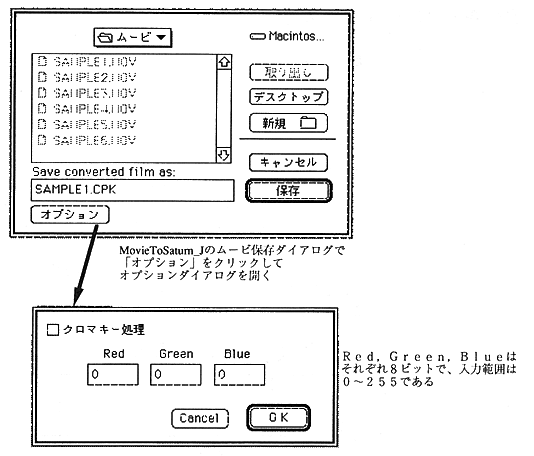 - Next, when converting with MovieToSaturn_J, click the "Options" button, select chroma key processing, and then enter the color value to be keyed out (Fig. 3.6). If the replaced color is pure green, enter "Red = 0, Green = 255, Blue = 0" and then convert to SEGA SATURN format.
