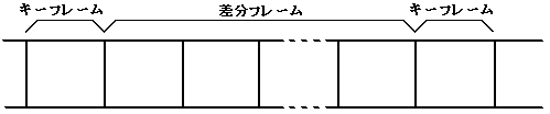 3.4 Keyframe Pose ● About keyframes There are two types of movie compression: spatial compression, which compresses data within a frame, and time compression, which compresses the part that does not change from the previous frame by not having data. Generally, a frame that is time-compressed is called a difference frame, while a frame that is only spatially compressed is called a key frame. Cinepak is a compressor that supports difference frames, and you can specify keyframes during compression to perform time compression. For example, if you say "keyframes every 30 frames", it will consist of 1 keyframe and 29 diff frames (actually, the Cinepak compressor may insert keyframes automatically, so it's actually Keyframes are not always inserted every 30 frames). The difference frame has a problem of a kind of blocking phenomenon that the time-compressed part looks like a block. If you compress without specifying a key frame, only each frame space compression will be performed and there will be no difference frame. Figure 3.7 Relationship between keyframes and difference frames
