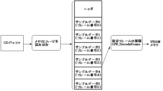 ● Keyframe pose The pause function (CPK_Pause function) in the Cinepak library provides parameters for specifying immediate poses and keyframe poses. If you specify a keyframe pose, it will not pause until the keyframe appears after the pause is activated. Therefore, if you specify a keyframe every second, you will have to wait up to 1 second after starting the pause. This is to ensure synchronization with the sound when unpaused. To avoid this, do not specify keyframes during Cinepak compression, or shorten the keyframe spacing. 3.5 Still image playback By loading the movie data into the memory in advance and expanding the specified frame (CPK_DecordeFrame function), the movie frame data can be used as a still image. Figure 3.8 Flow of still image playback