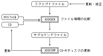 The date and time of the file on the DOS and the file on the CD-R disk are compared, and if the file on the DOS is newer, it is determined that the file has been changed. Figure A.1 ADDGEN data flow