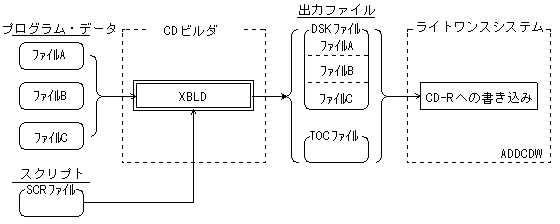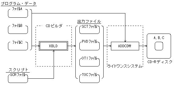 ADDCDW writes to a CD-R disc while creating a sector image of the disc from these files and the source file of the program data.- When writing on the fly, specify the "oti subcommand" of XBLD.