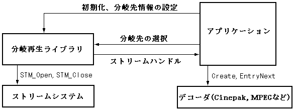 ★ PROGRAMMER'S GUIDE ★ Branch playback library┌────────────────────────────────────────┐ │ │ │ Application │ │ │ └────────────────────────────────────────┘ ┌───────┐┌───────┐┏━━━━━━━┓┌──────┐┌─────┐ │ │ │ Cinepak │ ┃ Branch playback ┃ │ │ │ │ │ │ MPEG │ │ Library │ ┃ Library ┃ │ ┌─── ┘ │ │ │ Library │ └───────┘┗━━━━━━━┛ │ │ ┌───┘ │ │ │ ┌─────────────────┘ │ │ File system │ │ │ │ │ │ Library │ │ │ │ Stream system library │ │ │ └───────┘└────────────────────┘└─────┐ │ ┌───────────────────────────────────┐ │ │ │ CD communication interface library │ │ │ └───────────┬───────────────────────┘└─┬─┘ Software │ │ ━━━━━━━━━━━━━━━━━━━┿━━━━━━━━━━━━━━━━━━━━━━━━━━┿━━━━ ━━━━━ Hardware │ │ ┌──────┴─────┐ ┌──────┴──────┐ │ CD block │ │ SIMM, SCSI file │ └────────────┘ └─────────────┘
