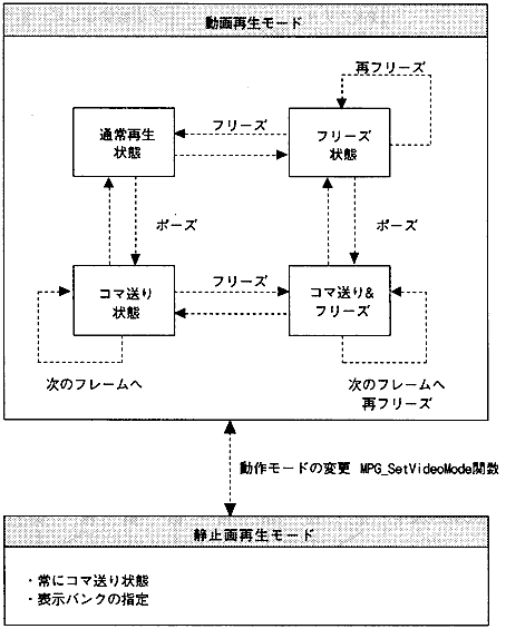 - In still image playback mode, the video stream data in the CD buffer can be decoded by specifying the frame bank number. You can specify the frame bank number to output and output it directly to VDP2, or transfer it to VRAM by the host and display it.