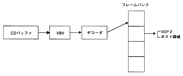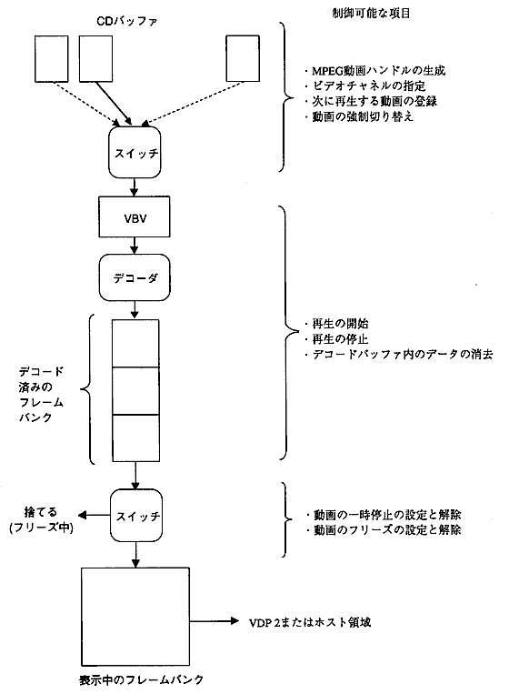 - The MPEG video data is read from the CD into the CD buffer and expanded by the decoder into the frame bank. The image data expanded in this frame bank is displayed in sequence to create a movie. There are two ways to display the frame bank data, one is to output directly to VDP2 and the other is to transfer it to VRAM by the host and display it. The data flow is shown below.