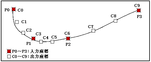 (2) Tangent vector at each output coordinate can be acquired As shown in Fig. 1, it is possible to acquire a point on a curve that smoothly passes through that point by specifying a small number of points. Figure 1 shows that if you specify the input coordinate array P0 to 3, the number of arrays 4, and the number of output coordinates 10, you can obtain an array of output coordinates that smoothly passes through that point as c0 to 9. You can also get the tangent vector at each output coordinate by using the tangent function. The tangent vector can be used for the direction of travel of the character. Figure 1 Conceptual diagram of curve calculation