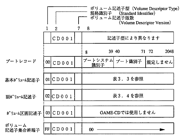 | Volume Descriptor Type Standard Identifier Volume Descriptor Version Volume Flag System Identifier Volume Identifier Unused Field Volume Space Size Unused Field Volume Set Size Volume Sequence Number Logical Block Size Path Table Size Location of Occurence of Type L Path Table Location of Optional Occurence of Type L Path Table Location of Occurence of Type M Path Table Location of Optional Occurence of Type M Path Table Directory Record for Root Directory Volume Set Identifier Publisher Identifier Data Preparer Identifier Application Identifier Copyright File Identifier Abstract File Identifier Bibliographic File Identifier Volume Creation Date and Time Volume Modification Date and Time Volume Expiration Date and Time Volume Effective Date and Time File Structure Version Reserved for future standardization Application Use Reserved for future standardization | Volume descriptor type standard identifier'CD001' Volume descriptor version Volume flag System volume name that uses LSN 0 to 15 Number of sectors in the entire unused volume Number of volumes in unused multi-volume = 1 Volume serial number at the time of multi-volume Logical block length Number of bytes in the entire path table Path table position in LSBF notation