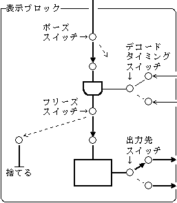 ![]() | 《Display block》 ・ Switching decoding timing ・ Setting and canceling video pauses ・ Setting and canceling video freezes ・ Switching output destinations |
