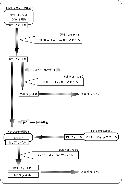 - The 3D model data modeled in SOFTIMAGE is passed to the programmer in the following flow.