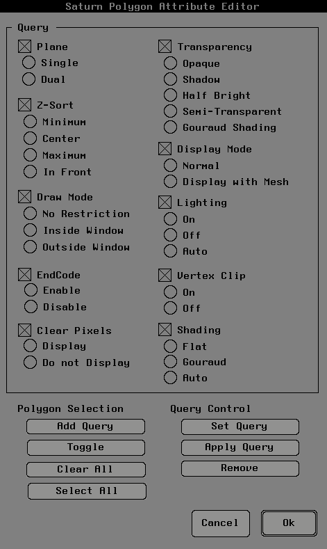 - Select the Polygon → Saturn Attribute Editor menu of the Matter module to open the editor shown below.