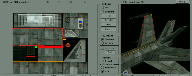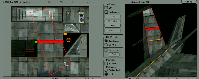 - If the orientation of the pasted texture does not match the desired orientation, select only that polygon and execute Polygon → UV ON Polygon → Rotate or Polygon → Flip. All polygons can be deselected by pressing Shift + g + middle mouse button (Unselect all polys).