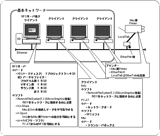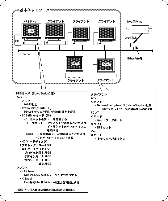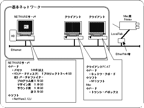 ★ SGL User's Manual ★ Development environmentThe programmer, designer, and sound development systems mentioned above can be developed more efficiently by being connected by a network. The network environment differs depending on the number of workers (number of machines). The specific network configuration (server, client) is explained below according to the number of developers.