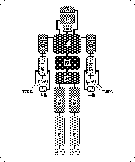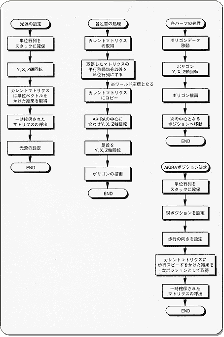 Here, I will introduce a demo program (demo_C) that animates a human body model walking. The model is Akira, a Virtua Fighter. Akira consists of 22 polygon objects, each of which has a hierarchical structure as shown in the figure below.