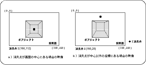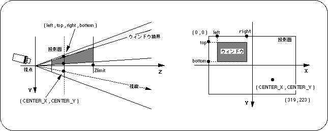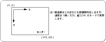 ● In screen mode (horizontal 320 x vertical 240)slWindow (0,0,319,223,0x7FFF,160,112); | | | | | Vanishing point coordinate value: center of screen | Zlimit Window range indication coordinate value