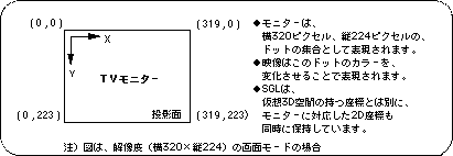 ★ SGL User's Manual ★ PROGRAMMER'S STRUCT This chapter describes the basic idea of 3D graphics and the subroutines that realize it. In this chapter, we will mainly use a mathematical method called coordinate transformation. It may be difficult to read because it uses a lot of unusual methods such as determinant calculation, but it is the basis of 3D graphics, so please read and understand it many times.