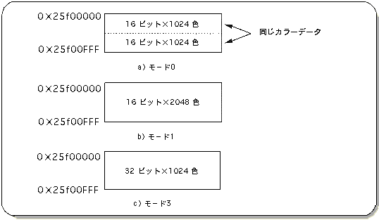 Color RAM mode 0: Used when using the extended color calculation function. Color RAM mode 1: Used when you want to use 2048 colors out of 32768 colors. Color RAM mode 2: Used when you want to use 2048 colors out of 16.77 million colors.