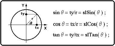 | FIXED | slSin | ANGLE angs | Returns a sine value for the specified angle |