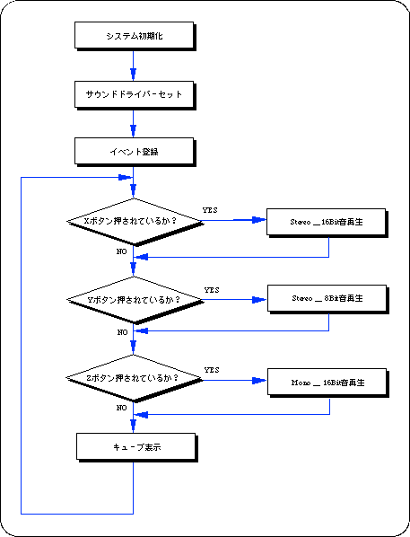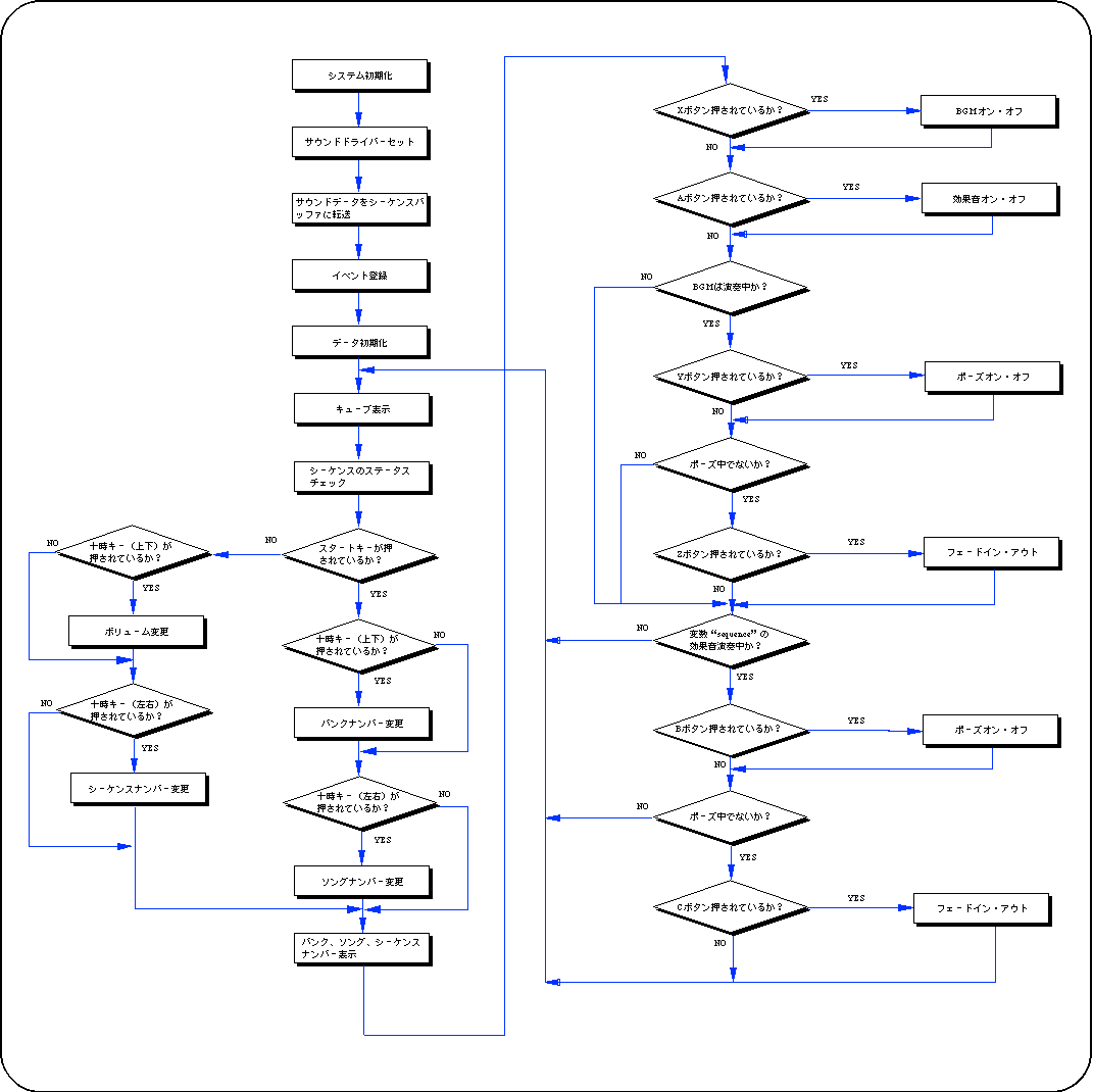 ┏━━━━━━━━━━━━━━┓ ┃Sound driver set ┃ ┃ and start MC68000 ┃ ┗━━━━━━━━━━━━━━┛ ↓ ┏━━━━━━━━━━━━━━┓ ┃Sound data set ┃ ┗━━━━━━━━━━━━━━┛ ↓ ┏━━━━━━━━━━━━━━┓ ┃BGM performance / sound effect, ┃ ┃ PCM sound source control ┃ ┗━━━━━━━━━━━━━━┛