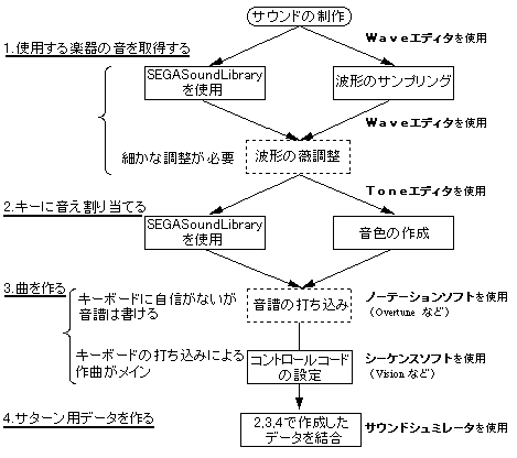 - The flow of sound production for Sega Saturn using the Sega Sound Tool is as shown in the figure below.
