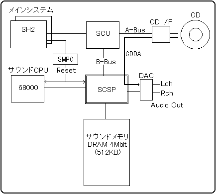 The sound system is centered on the sound source LSI, and the sound CPU and 512KB sound memory, the main system and the CD interface, etc. are connected. The main system can access the entire IO space of the sound memory and SCSP via the SCU, and can control the stop (reset) and restart (reset release) of the sound CPU through the SMPC.