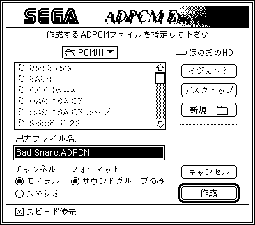 - The output file is a simple sound group array and does not have any header or sector boundary filler, so it can be used as is in SEGA SATURN's ADPLIB.