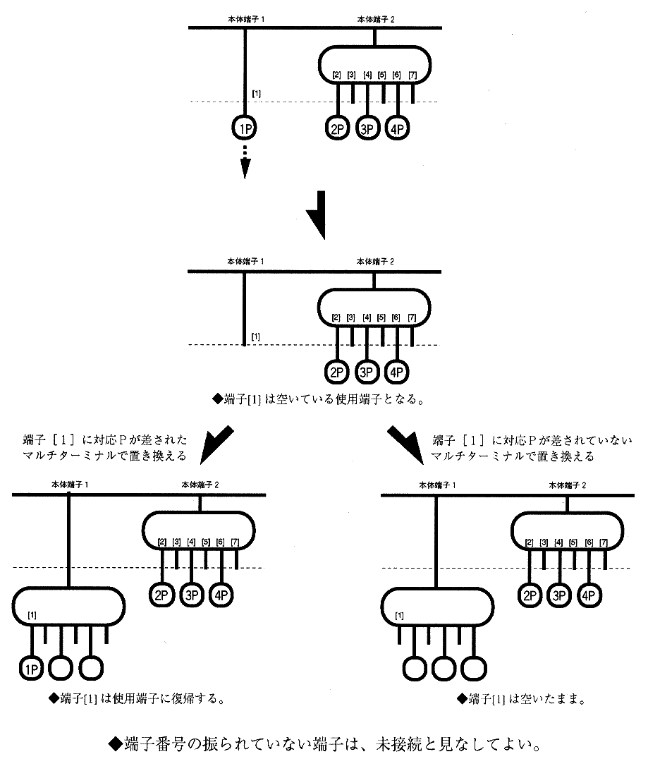 <Multi-terminal setting principle> -If the corresponding P or multi-terminal is not connected to the main unit terminal 1, the game must not be started. -When a multi-terminal is connected to the main unit terminal 1, if the corresponding P is not connected to any terminal of the multi-terminal, the game must not be started. -In the case of multiplayer play, it must operate normally regardless of which of the main body terminal 1 and the main body terminal 2 is connected to the multi-terminal. (Refer to the connection example on the next page) -When assigning operation numbers, always give priority to the terminal with the lowest number (terminal on the left side) depending on the connection status of the multi-terminal, and do not reverse the operation number. |